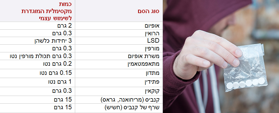 לכל אחד מן החומרים המוגדרים כ"סם" קבועה כמות מקסימלית, אשר מי שנתפס ובחזקתו החומר בכמות זו או בכמות הפחותה ממנה יוגדר כמחזיק את הסם לצורך שימושו העצמי. סעיף 7(ג) בפקודת הסמים המסוכנים קובע כי העונש המרבי על החזקת סם לשימוש עצמי הוא שלוש שנות מאסר. יחד עם זאת, במידה והעבירה נעברה בתחומי בי"ס על ידי אדם שאינו תלמיד וגילו מעל ל-16 – העונש המרבי יעמוד על חמש שנים. כאשר המדובר בכמויות שאינן לשימוש עצמי או בייצור סמים, העונש המרבי מטפס, עולה ומגיע ל-20 שנות מאסר. העונש החמור ביותר בתחום עבירות הסמים שמור להדחת קטינים לשימוש בסמים. העונש המרבי המוגדר על עבירה זו עומד על 25 שנות מאסר, והחוק אף מציין, כי על עבירה מסוג זה תמיד יחול עונש המאסר בפועל.